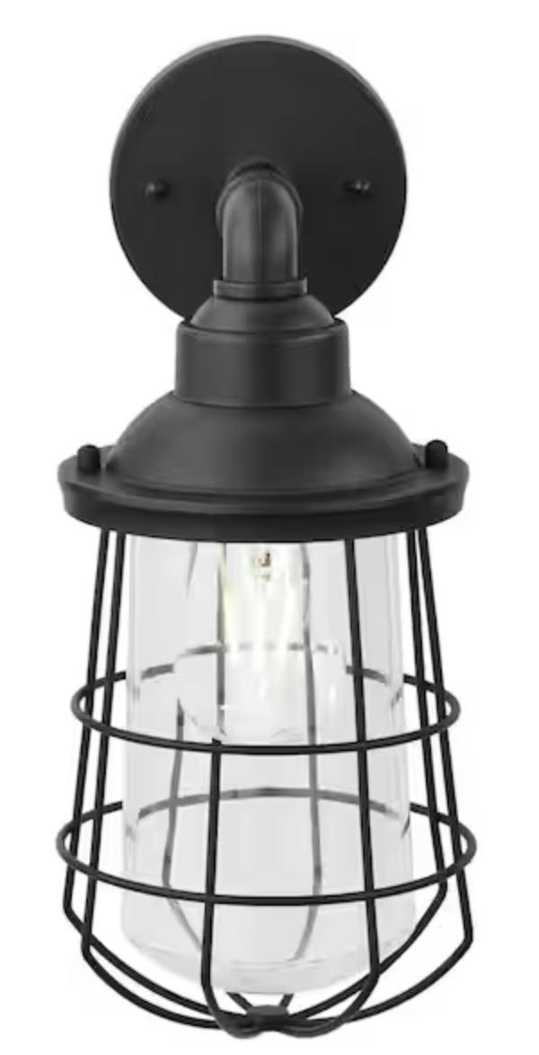 This Wall-Mount 1-Light Black Outdoor Nautical Wall Lantern has transitional style, Clear Glass and outer decorative metal cage. Ideal for front entrance, porch, garage, patio spaces and more. Each light fixture uses one 60-Watt maximum medium-base Bulbs or LED equivalent (not included).